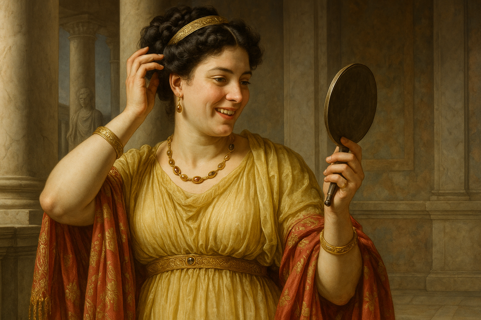 Alla fine di questo viaggio nella moda femminile romana, la domanda “cosa indossavano davvero le donne romane?” non trova una sola risposta, ma mille sfumature, tutte diverse e tutte ugualmente vere. C’è chi cerca di ricondurre ogni cosa all’ideale di sobrietà e chi, invece, continua a scandalizzarsi davanti a un bracciale troppo largo o una stola troppo trasparente. Se resta un’eredità, è proprio quella della libertà di reinventarsi, di sperimentare, di prendere le regole e capovolgerle a proprio vantaggio. Ed è forse questa, più di ogni altra, la vera lezione che ci lascia la moda della Roma antica: che tra eleganza e “trash”, il confine è sottile, mobile, sempre pronto a essere superato. Nell’immagine finale, una matrona si specchia, ride dei propri eccessi, e – come noi – trova piacere nel sorprendersi ogni giorno diversa nello specchio della storia.
