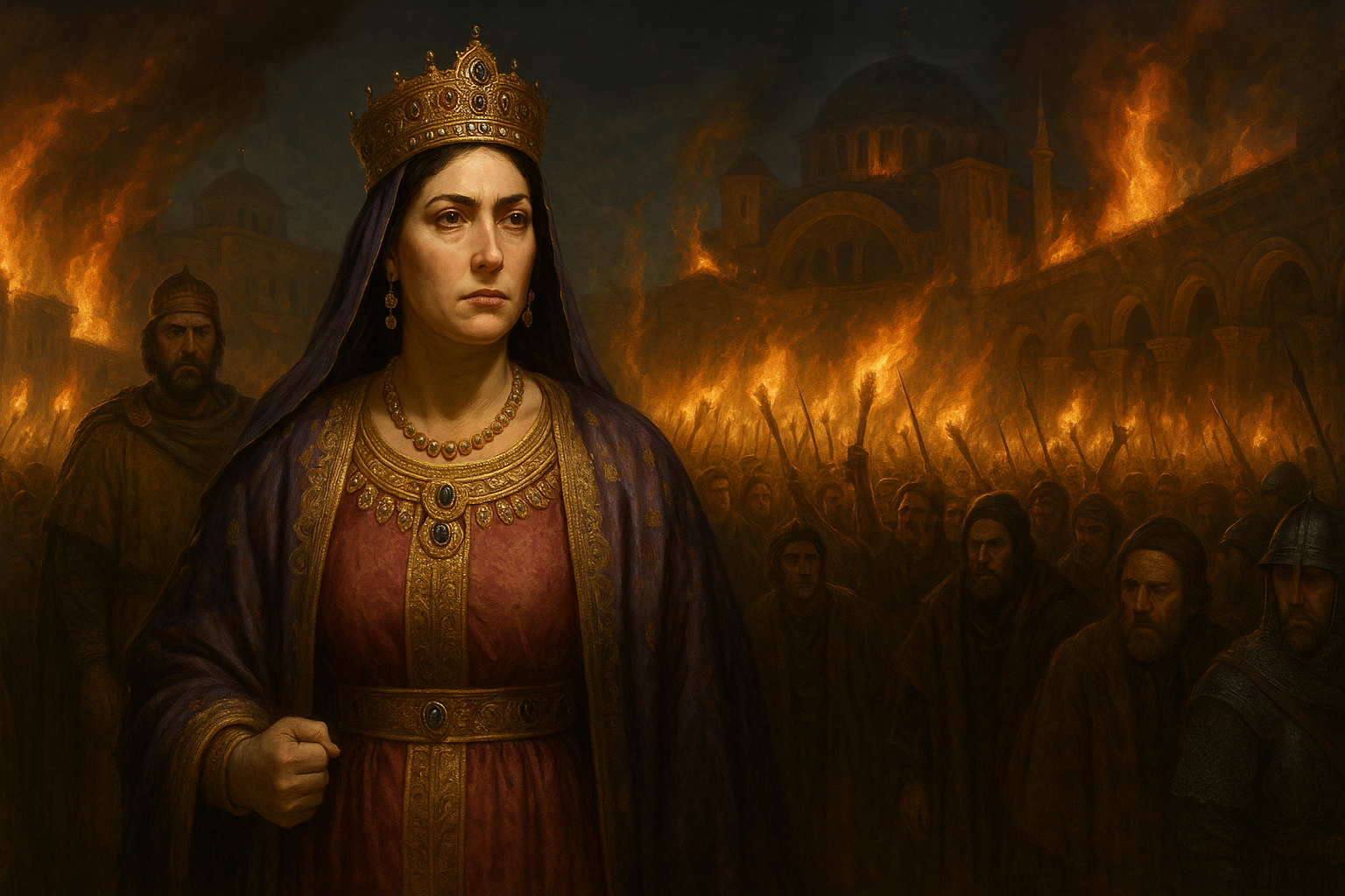La notte che cambiò il destino di una civiltà intera ebbe il volto di una donna che la storia avrebbe ricordato, secoli più tardi, come una delle figure femminili più influenti e discusse dell’antichità: Teodora, imperatrice accanto a Giustiniano, il dominatore della fragile e scintillante Costantinopoli. Nella città, cuore pulsante dell’Impero romano d’Oriente, le passioni popolari potevano esplodere inondate d’oro e sangue, e nessun evento lo testimonia meglio della celebre rivolta di Nika del 532, che travolse la capitale in giorni di paura, violenza, disperazione e rinascita, consegnando Teodora all’immortalità dell’agire politico e del coraggio personale.