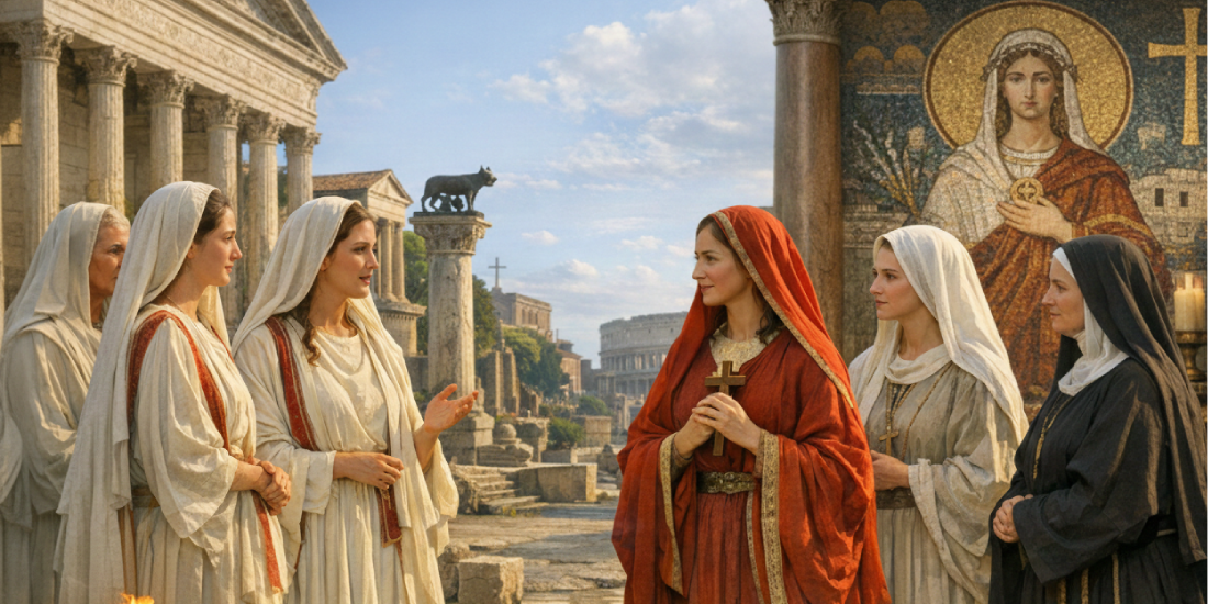 Questa chiamata trovò risposta in tempi sorprendentemente precoci. Già negli Atti degli Apostoli (21, 8-9) compaiono le quattro figlie di Filippo Evangelista, che avevano scelto la vita verginale. Nel II secolo d.C., sant’Ignazio di Antiochia cita un gruppo di donne della chiesa di Smirne consacrate alla castità. A Roma, il Pastore di Erma offre un’immagine ancora più vivida: Erma viene accolto da un gruppo di vergini e trascorre la notte in preghiera con loro — una scena difficile da considerare puramente simbolica.