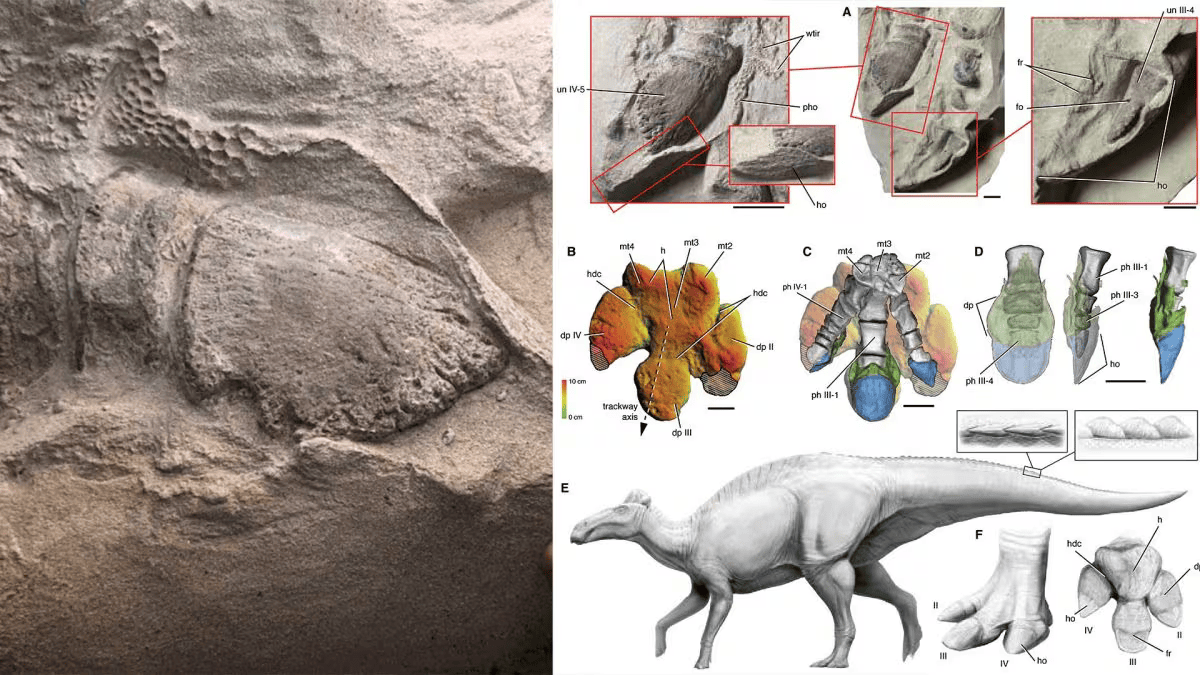 Questi ultimi, individuati sopra gli ungueali delle dita dei piedi posteriori, si manifestano come guaine di cheratina a forma di cuneo, dal fondo piatto, simili per estensione e dettaglio a quelli degli ungulati, sia preistorici che attuali. Il più grande degli zoccoli, appartenente al terzo dito, supera i quindici centimetri. Secondo il gruppo di ricerca guidato da specialisti dell’Università di Chicago e da enti scientifici statunitensi, la presenza di guaine cheratinizzate simili era stata ipotizzata in passate osservazioni su adrosauridi, ma mai prima d’ora queste strutture erano state svelate con tale precisione e completezza. Gli zoccoli, infatti, vanno oltre la semplice unghia, estendendosi proprio come negli ungulati di altre epoche e persino in quelli attuali.